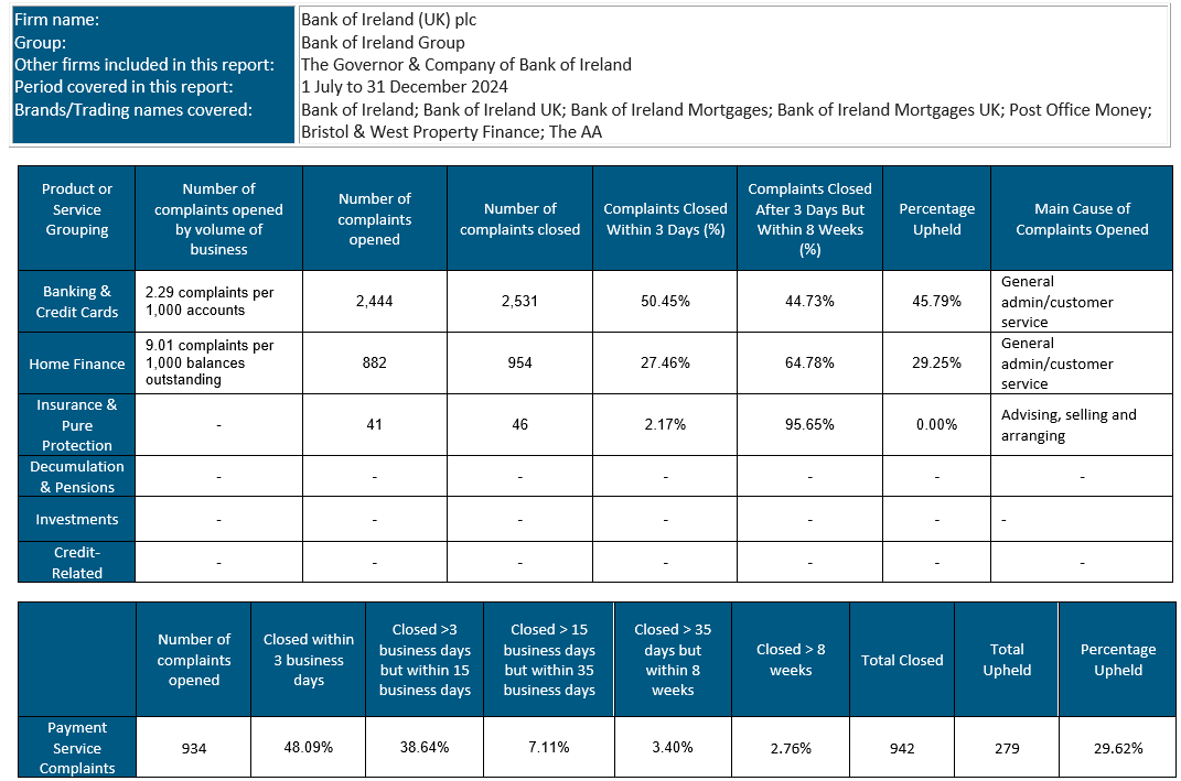 Complaints Performance Data Publication – Bank of Ireland (UK) plc: 1 January – 30 June 2025