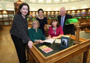 NO REPRO FEE 5/12/2017 National Library announces details of major Heaney exhibition. Pictured today at a special reception at the National Library of Ireland (NLI) to announce details of a major international exhibition telling the story of the work of Nobel Laureate Seamus Heaney are Marie Heaney, wife of Seamus Heaney, Dr Sandra Collins (centre), Director of the National Library of Ireland, Minister for Culture, Heritage, and the Gaeltacht, Josepha Madigan TD (seated right), Chief Executive Officer of Bank of Ireland, Francesca McDonagh and Paul Shovlin, Chairman National Library. A partnership project between the NLI, the Department of Culture, Heritage and the Gaeltacht and Bank of Ireland, the exhibition, entitled “Seamus Heaney: Listen Now Again”, will draw on the National Library’s extensive archive of Heaney documents and will feature Heaney’s original manuscripts as well as letters, unpublished works, diary entries, photographs, note books and multi-media recordings. The exhibition, which is due to open to the public in summer 2018, will be the first exhibition to be housed in the new Bank of Ireland Cultural and Heritage Centre within Bank of Ireland’s College Green complex. For further information about the exhibition, visit www.nli.ie. PHOTO: Mark Stedman