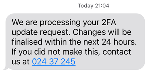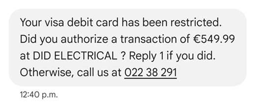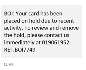 - The texts claim to be from Bank of Ireland and can drop into the thread of a genuine BOI text: “Did you login from a new device?”; “Do you recognise this transaction?”; or “A transaction for [value] to [merchant] was declined and your card has been placed on hold“ – followed by “if this was not you / if you don’t recognise this / etc. please call us back on [callback phone number].