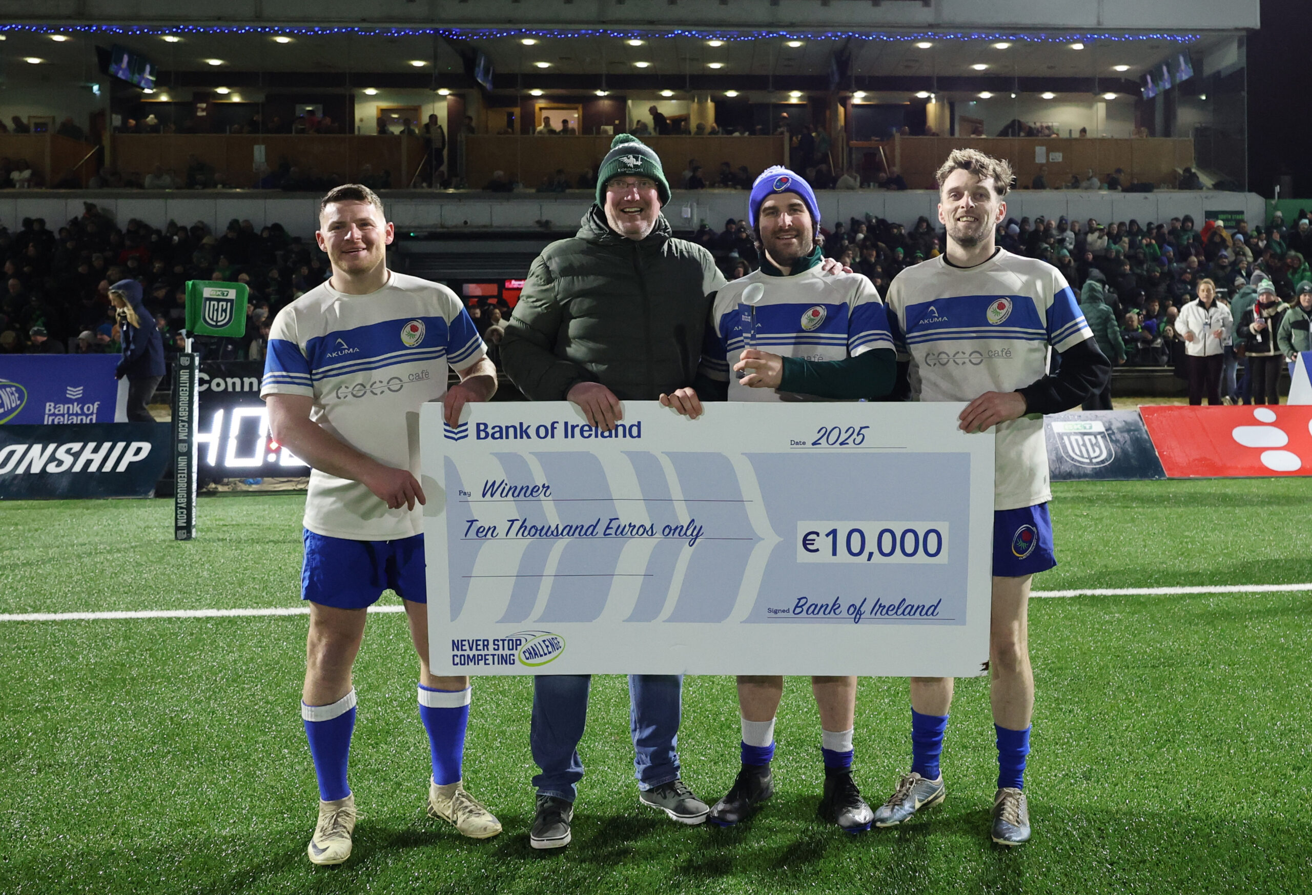 OLBC RFC, represented by Liam Tierney, Chris Lane and Lorcan Foley overcame their opponents from Corinthians RFC during the ‘Never Stop Competing’ challenge at half-time in the Connacht Rugby vs Cardiff Rugby match to claim the €10,000 prize for their club.