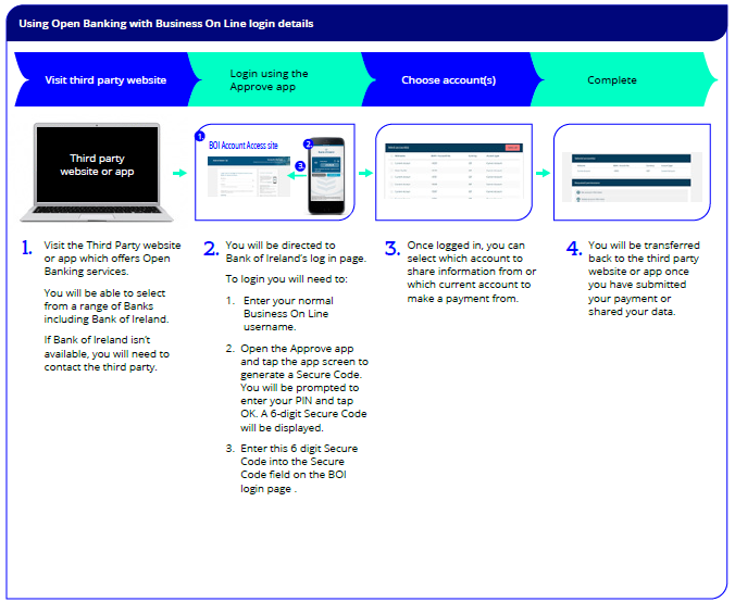 If you wish to avail of Open Banking Services your Business On Line administrator will need to provide you with the necessary group access to enable you to use Open Banking Services. Once you have the necessary access go to the app or website of the registered third party provider and select the services you wish to use.