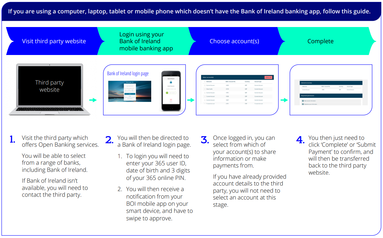 Go to the website or app of the registered third party provider and select the services you wish to use. They will redirect you to a secure Bank of Ireland login page or the Bank of Ireland app, where you will have to login to use Open Banking services. The step-by-step guide below describes how to login.