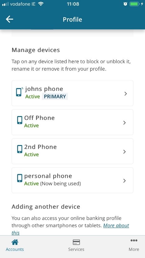 This will show the devices registered to your 365 online profile. The device you are using will be labelled (Now being used). In the example here on the left, Karls phone is both the primary device and the one that is being used with the BoI app.