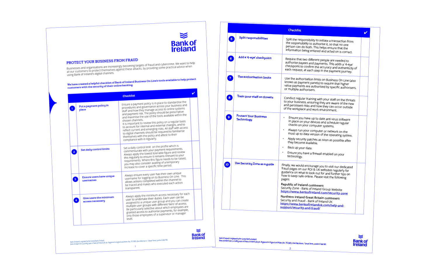 Businesses and organisations are increasingly becoming targets of fraud and cybercrime. We want to help all our customers to protect themselves against these attacks, by providing some practical advice when using Bank of Ireland’s digital channels. We have created a helpful checklist of Bank of Ireland Business On Line’s tools available to help protect customers with the security of their online banking.